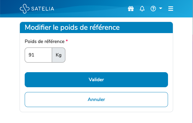 Lorsque vous cliquez sur ce bouton, une page s'ouvre et vous avez la possibilité de rentrer le nouveau poids de référence du patient.