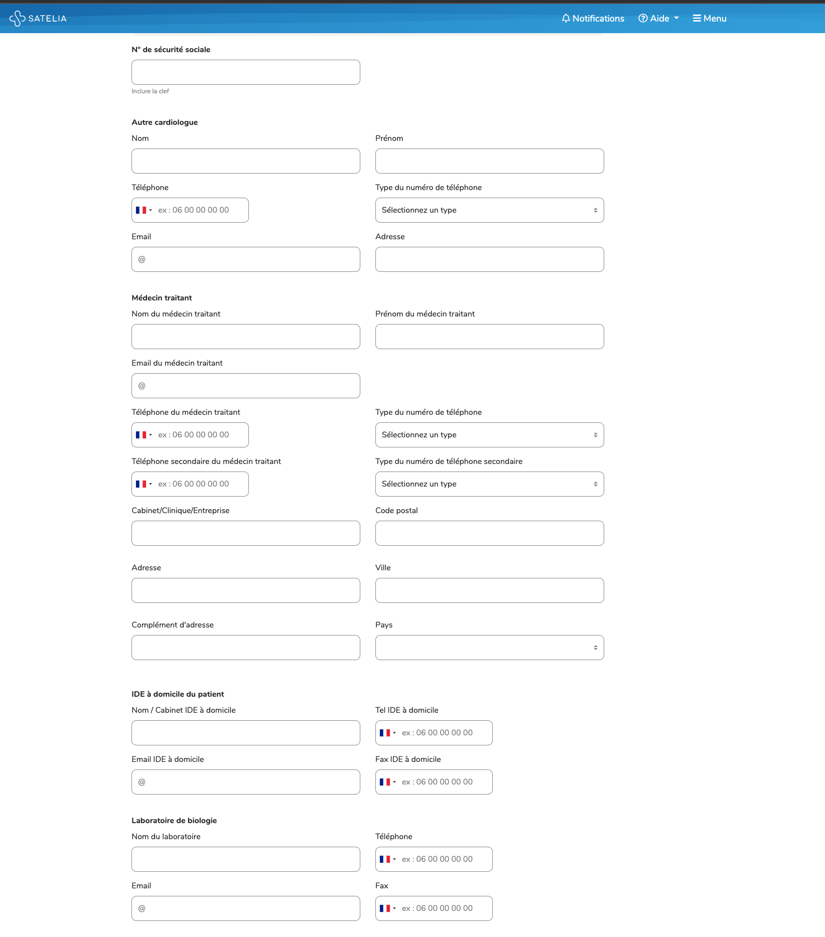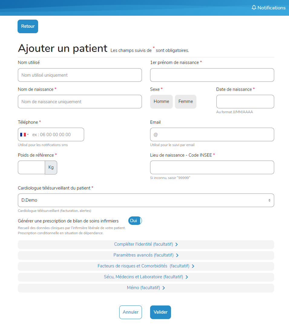Renseignez les coordonnées des professionnels de santé ( i.e. médecin traitant, cardiologue, IDE(L)) et des aidants du patient pour assurer un suivi optimal. Cela permet de rediriger le patient vers les bons interlocuteurs en cas d’absence du cardiologue référent. Si le patient ne peut pas remplir le questionnaire lui-même, les coordonnées de l'aidant faciliteront la prise en charge.