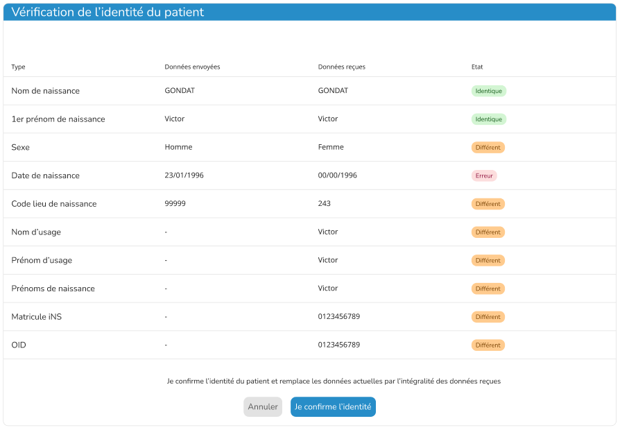• Une seule identité trouvée : La fenêtre compare les données saisies avec celles de l’INSi, indiquant si elles sont identiques, différentes, ou s’il y a une erreur (par exemple, champ vide).