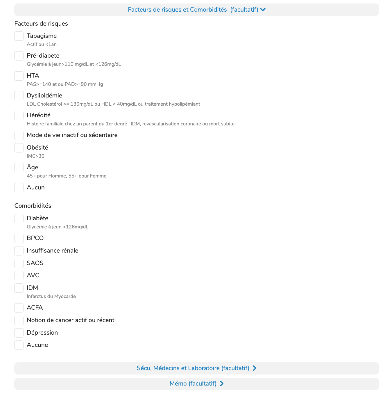 Cette section aide les équipes médicales et Satelia® à mieux identifier les facteurs de risque et les comorbidités du patient. Ces informations permettent à Satelia®, lorsqu’elle réalise l’ATP, de personnaliser et d’adapter les séances. Elles servent également à analyser les différents profils de patients présentant des facteurs de risque et des comorbidités, afin de repérer d'éventuels liens de causalité ou de corrélation. Ces analyses pourront ensuite contribuer à faire évoluer l’algorithme de Satelia® Cardio et à en améliorer les performances.