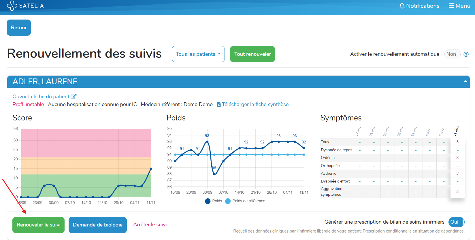- Sélectionnez la fiche du patient concerné et cliquez sur "Renouveler le suivi". Vous pouvez également renouveler le suivi de tous vos patients en une fois en utilisant l’option "Tout renouveler".