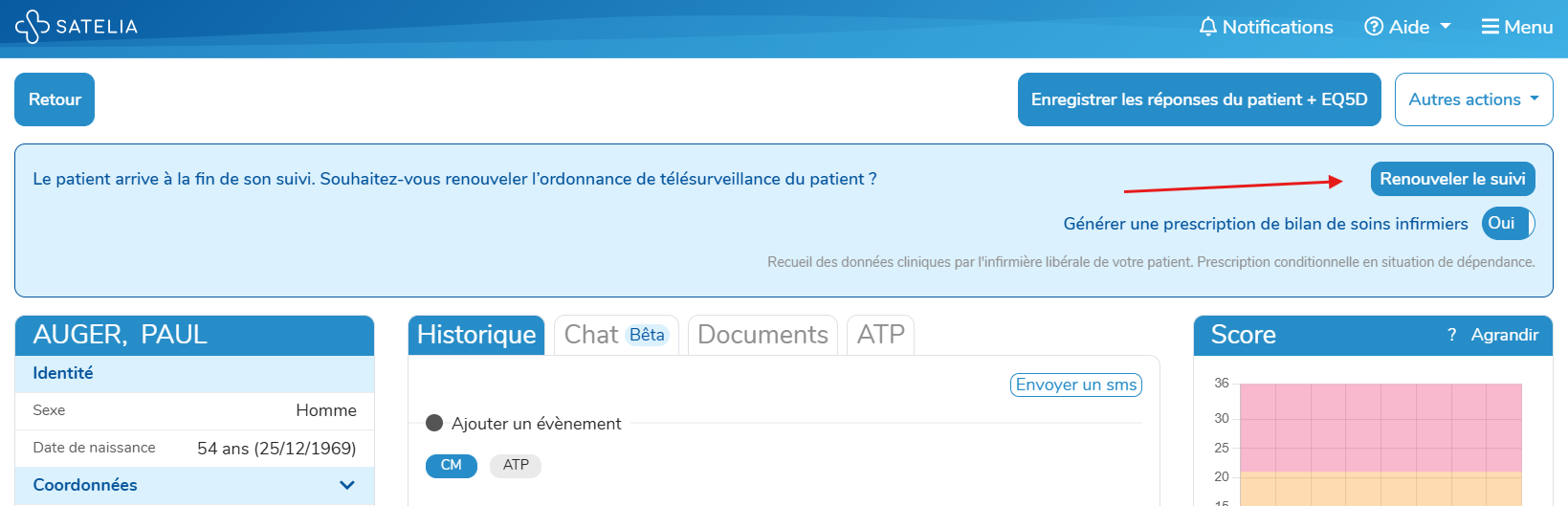 Vous pouvez également renouveler le suivi directement depuis la fiche du patient :