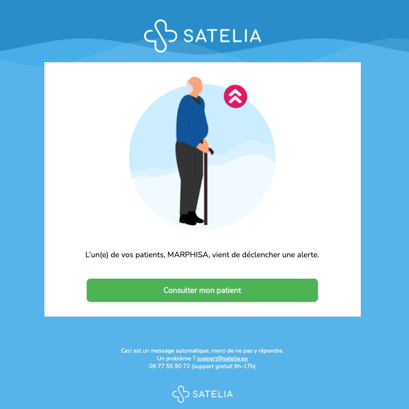 “Bonjour, votre patient {Prénom du patient} a déclenché une alerte rouge.